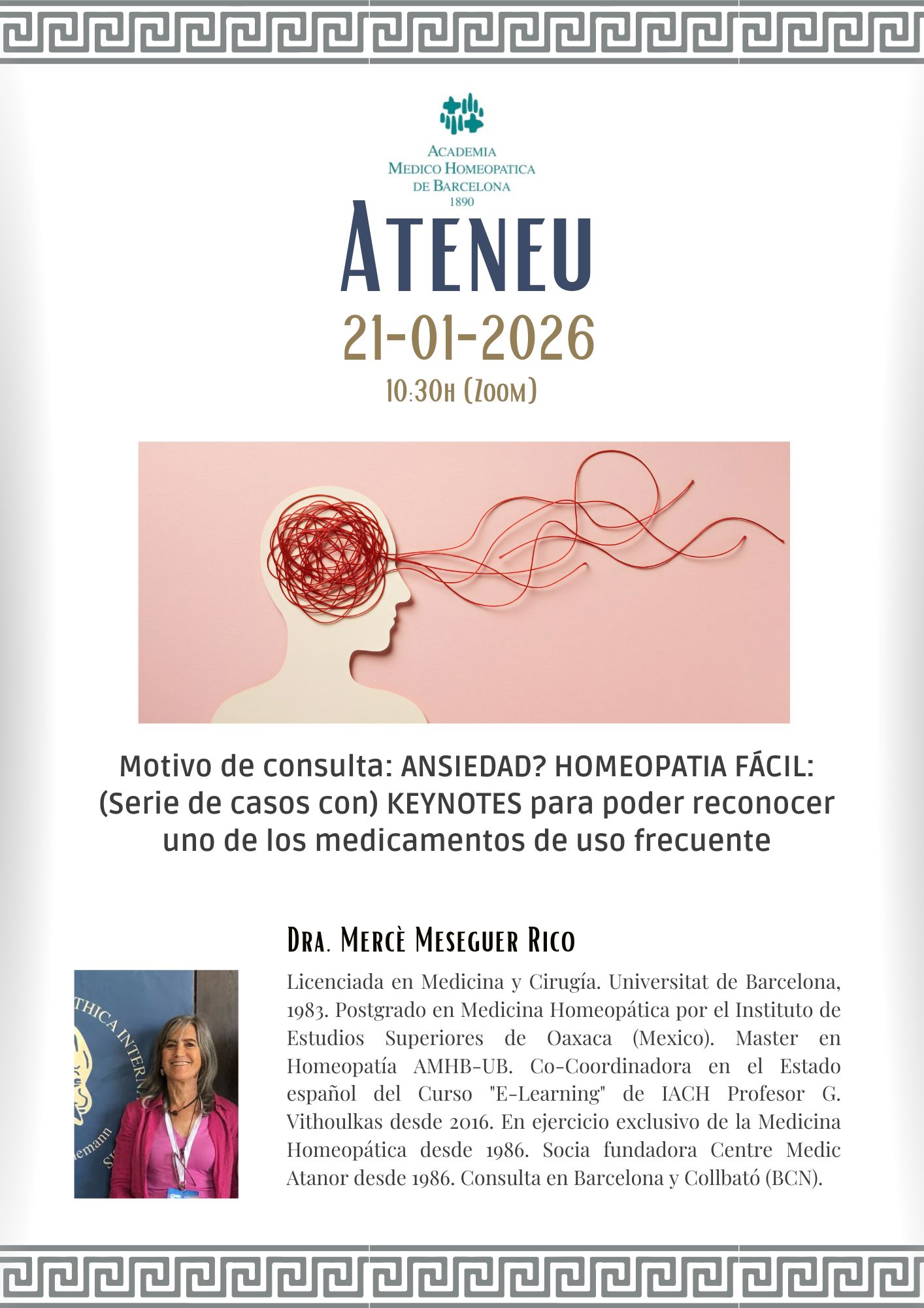Presentación del caso a cargo de la Dra. Mercè Meseguer: Motivo de consulta: ANSIEDAD? HOMEOPATIA FÁCIL: (Serie de casos con) KEYNOTES para poder reconocer uno de los medicamentos de uso frecuente. Este encuentro se hace …
