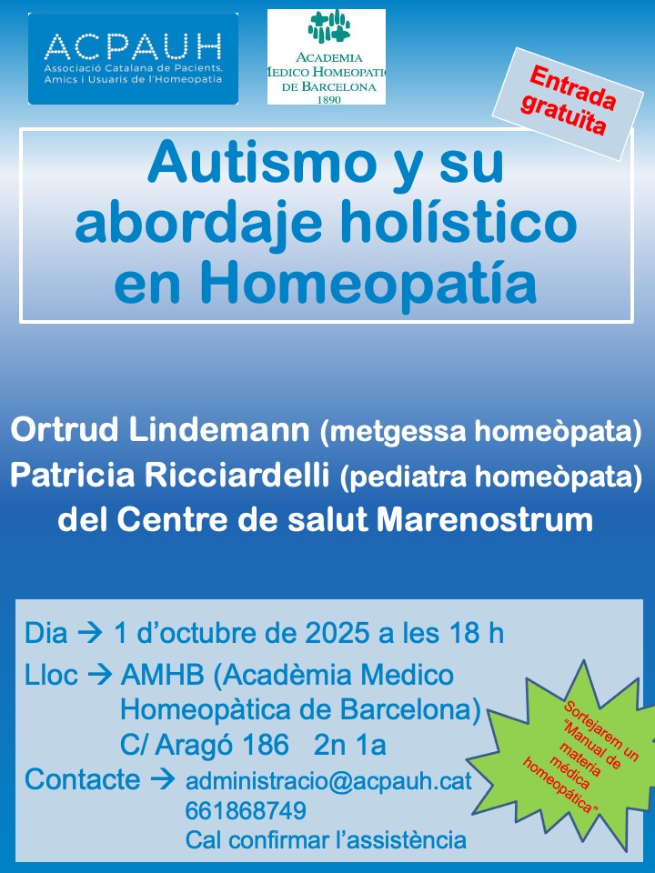 El dimecres 1 d'octubre, a les 18h, tindrà lloc a la seu de l'AMHB (C. Aragó, 186, 2n1a), la xerrada "Autismo y su abordaje holístico en homeopatía" , a càrrec de les Dres. Ortrud Lindemann (metgessa homeòpata) i Patricia Riciardelli (pediatra homeòpata).